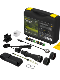 Taschenlampe, magnetische Schnellwechsel-Halterung, Farbfiltern und magnetische Fernschalter mit Spiralkabel werden in einer stabilen Kunststoffkoffer geliefert, die bequem mitgeführt werden kann. Zum Lieferumfang gehören zwei Akkumulatoren mit hoher Kapazität von 3500 mAh, ein magnetisches USB-Ladekabel sowie Zubehörteile der Serienausstattung der Predator Pro.