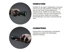 Taktisches Modell einer neuen Generation mit weichem breiten Licht für die Jagd im offenen Gelände und spezielle Aufgaben. Der große zentrale Lichtkegel und die breite seitliche Ausleuchtung qualifizieren die Viking Pro als ideale Lösung für kurze und mittlere Entfernungen von 50-70 Metern bei einer maximalen Leuchtweite bis zu 288 Metern. Die Helligkeit des Lichtstroms erreicht dabei beeindruckende 2200 Lumen.