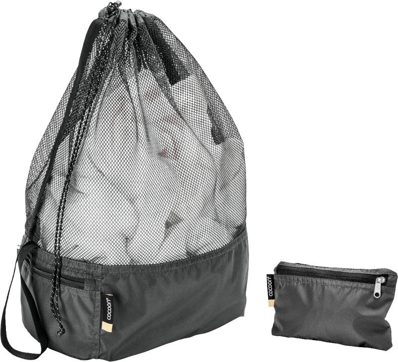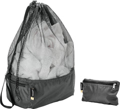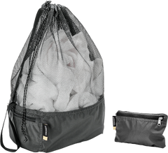 Praktischer Netzbeutel mit TPU laminiertem, wasser- und schmutzabweisendem Boden, der sich ideal als Wäschesack oder Strandbeutel eignet. Mit Schultergurt und laminierter Seitentasche mit wasserabweisendem Reißverschluss für Waschmittel und Münzen. In laminierte Seitentasche verpackbar.