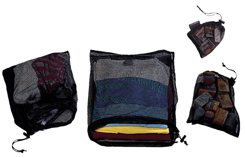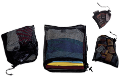 Set aus vier Netzbeuteln zum Ordnen von Reiseutensilien in Reisetaschen, Koffern und Rucksäcken.