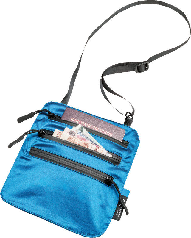Umhängbarer Brustbeutel zur sicheren Aufbewahrung von Geld und Reisedokumenten. Schützt Geld und Pass vor Schweiß und Wasser. Aus 100% Seide mit TPU Innenlaminierung. Drei Taschen mit YKK Aqua Guard Water Repellent Zipper. Verstellbares Halsband.