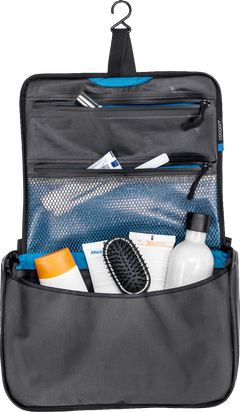 Aufhängbare und aufstellbare Toilettentasche mit großem Raumangebot aus wasserdichtem, schmutzabweisendem TPU laminiertem Oxford Nylon. Der Allrounder hat zwei offene Taschen und zwei Taschen mit YKK Aqua Guard Water Repellent Zipper. Aufhängbar mit rutschfestem, verstaubaremAufhängehaken.