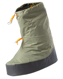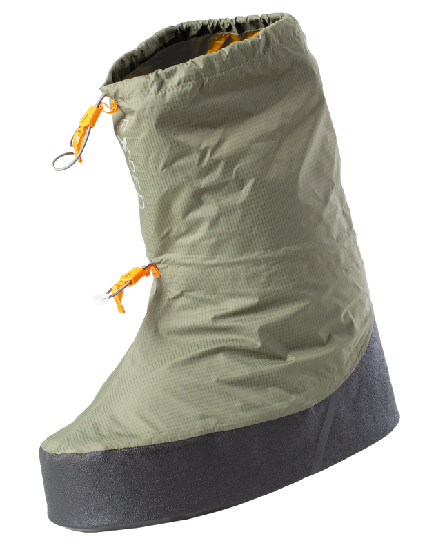 Wasserdichter Überschuhe für alle Exped Camp Booties, Down Socks und Camp Slipper! Das ist der ultimative Überschuh für das Base-Camp, beim Winter-Trekking oder für das Laufen auf leisen Sohlen im Wald-Camp. Die erstaunlich robuste Sohle, welche aus umweltfreundlichem TPU Rohmaterial hergestellt ist, ist an den Seiten extra hochgezogen, um dem Stoff rundum Schutz zu geben gegen Eis, Kanten oder Stöckchen. Der spezielle Fersenschutz ist wie die Sohle aus haltbarem EVA Schaum und sorgt für gute Isolation auch wenn die Beine auf der selbstgeschaufelten Schneebank mal ausstreckt werden. Zwei justierbare, elastische Bänder können auch mit dem Handschuh und einer Hand bedient werden um den Bivy Booty am Fuss zu fixieren. Die Innennähte sind komplett verklebt und der leichte, grüne 3-Lagen Aussenstoff(Exped VentAir®) ist hoch wasserdampf-durchlässig.
