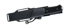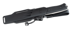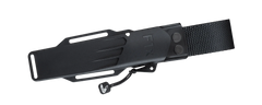 Besondere Aufmerksamkeit wurde auch der sicheren Messerscheide gewidmet, in der das Messer die meiste Zeit verbringen wird. Die Scheide verfügt über eine Transportsicherung (ein klappbarer Bügel mit Riemen) und ein weiteres Sicherheitselement, das das Messer sicher an seinem Platz hält, bis du es benötigst. Diese doppelte Sicherung erlaubt es, das Messer sicher mit der Spitze nach oben oder unten am Körper oder an der Ausrüstung zu befestigen.