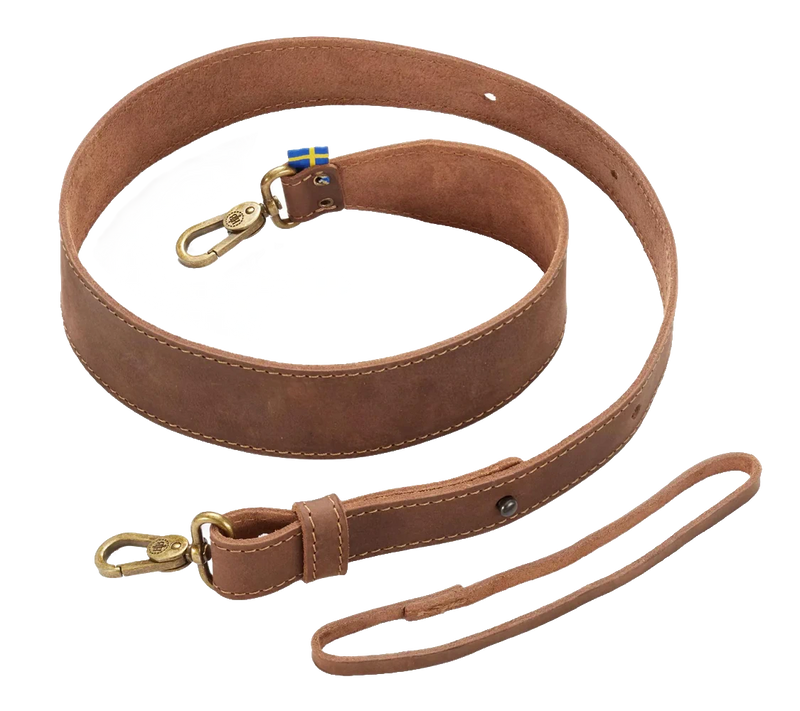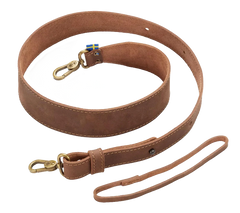 Der Schulterbereich ist verbreitert, um das Gewicht besser zu verteilen und den Tragekomfort zu erhöhen. Befestigt wird die Schlinge über zwei stabile Karabiner – einer am Schaft (via Lederriemen), einer an der Axtscheide (bei neueren Modellen mit Befestigungsloch).