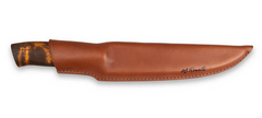 Zum Lieferumfang gehört eine handgefertigte, dunkelbraune Lederscheide aus pflanzlich gegerbtem finnischem Leder – langlebig, hochwertig und perfekt an das Messer angepasst.