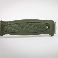 Der ergonomisch geformte Griff aus Polyamid ist mit dem klassischen Dala-Muster versehen und verfügt über einen integrierten Fingerschutz. Dadurch liegt das Messer auch bei Nässe, Kälte oder mit Handschuhen sicher in der Hand. Die mitgelieferte beidseitig tragbare Polymer-Scheide eignet sich für Rechts- und Linkshänder und besitzt eine praktische Gürtelschlaufe.