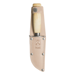 Der tonnenförmige Griff aus geöltem oder gefärbtem Birkenholz ist ergonomisch auf Kinderhände abgestimmt und in Natur Blau oder Pink erhältlich. Die mitgelieferte Scheide aus pflanzlich gegerbtem Leder verfügt über eine Gürtelschlaufe und einen klassischen Druckknopf der das Messer sicher fixiert. Das eingeprägte Wappen aus Dalarna erinnert an die lange Handwerkstradition von Morakniv.