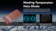 Die Nitecore SUMMIT20000 ist eine hochleistungsfähige Powerbank aus der Power Solutions-Serie,  speziell entwickelt für den Einsatz bei extremer Kälte. Sie bleibt bis −40 °C zuverlässig  einsatzfähig und liefert bei −20 °C immer noch 70 % ihrer Nennkapazität.  Möglich wird dies durch eine integrierte, automatische Heizfunktion, die ab 0 °C aktiviert wird und die  Zelltemperatur konstant hält.